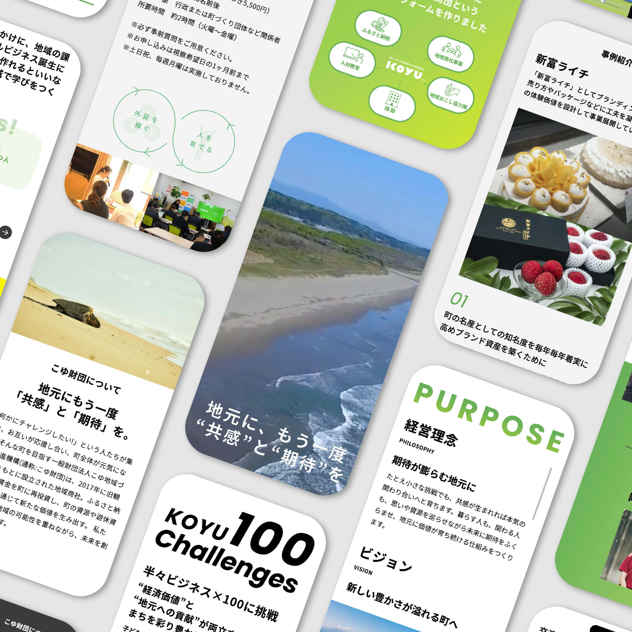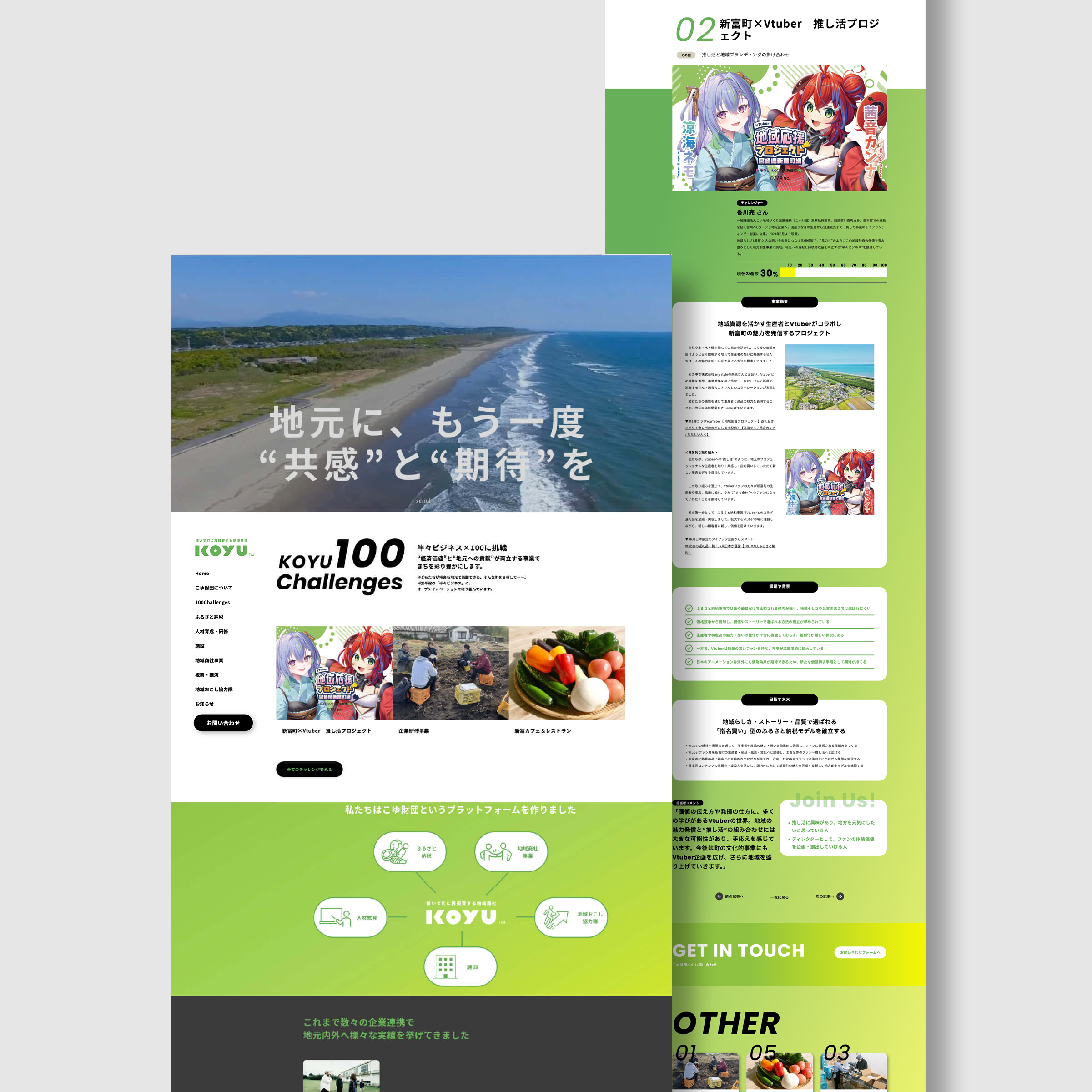 こゆ財団の幅広い事業領域とそのチャレンジを通して、訪れる人それぞれの立場での「関わりしろ」が見えてくる構成としています。